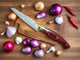 The cleaver's handle is a work of art and ergonomics, made from solid carbon fiber with a captivating red fleck design, providing both comfort and a secure grip during use. Enhanced with solid brass fittings, this cleaver not only performs exceptionally but also stands as a statement piece in any kitchen.